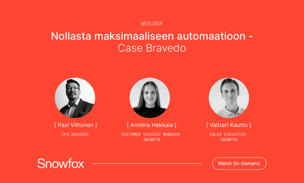 Watch Webinar Replay Nollasta maksimaaliseen automaatioon: Case Bravedo Live Virtual Session · Finnish · 46 minutes Get In Touch Webinar Hosts: Pasi Vilhunen CFO, Bravedo Anniina Hekkala Customer Success Manager, Snowfox Valtteri Kautto Sales Executive, Snowfox